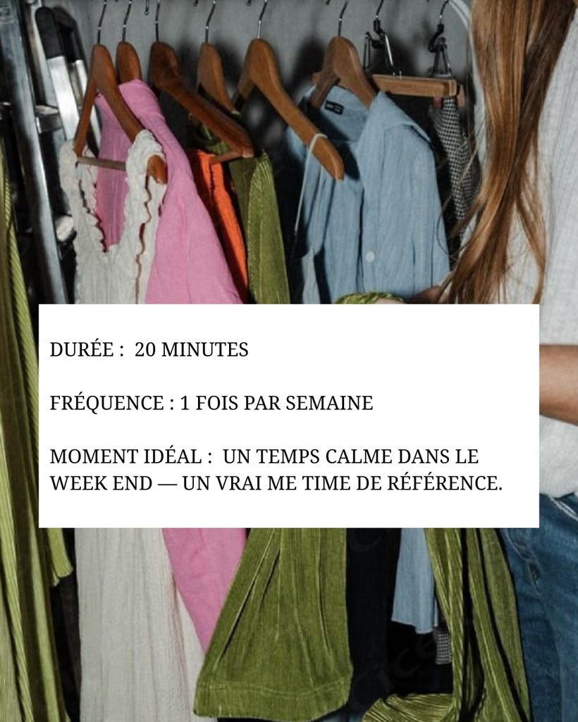 À rythme hebdomadaire, cette routine allège la charge mentale et fait sauter les derniers parasites, conscients ou inconscients, ceux qui vous empêchent de vous sentir en phase avec vos vêtements (ceux stockez, ceux à venir).